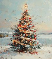 Kerstboom | Kerstboom met Ballen - Dit is een kerstboom schilderij van een rijk versierde kerstboom met glimmende kerstballen, gouden linten en een ster bovenop in een moderne impressionistische impasto-stijl tegen een zacht sneeuwig winterlandschap, kerstboom schilderij, schilderij kerstboom.