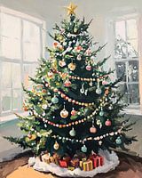 Kerstboom | Kerstdecoratie - Dit kerst schilderij toont een volledig versierde kerstboom met kleurrijke ballen en lichtslingers, omringd door cadeautjes, staande naast een licht venster.