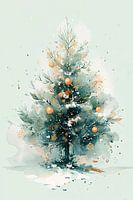 Een aquarel interpretatie van een kerstboom in zachte turquoise en teal tinten, versierd met gouden accenten en sneeuwvlokken. De boom heeft een ethereal, bijna mystieke uitstraling door de vervloeiende waterverftechniek en spetters die doen denken aan vallende sneeuw. Warme oranje kerstballen zorgen voor een feestelijk contrast tegen…