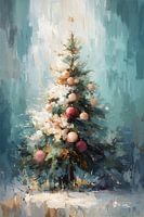 Een sfeervolle impressionistische weergave van een kerstboom, geschilderd in zachte, dromerige pasteltinten tegen een turquoise achtergrond. De boom is gedecoreerd met roze en rode ballen die als lichtpuntjes oplichten tussen de dennentakken. Het geheel straalt een zachte, romantische kerstsfeer uit waarbij de losse penseelstreken een…