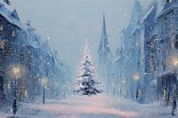 Een eenzame kerstboom staat centraal op een verlaten stadsplein, omringd door historische gebouwen en zacht neerdwarrelende sneeuwvlokken. De blauwe tinten en subtiele verlichting van de straatlantaarns creëren een kalme, bijna verstilde sfeer. De hoge kerktoren op de achtergrond voegt een vleugje klassieke charme toe aan dit…