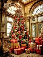 Deze foto toont een weelderig versierde kerstboom in het midden van een weelderige kamer met goudkleurige houten lambrisering en grote, gewelfde ramen. De boom is rijkelijk versierd met rode linten, gouden en rode kerstballen en andere feestelijke ornamenten. De top is versierd met een grote stervormige boomversiering. Liefdevol ingepakte cadeautjes in rood- en goudtinten zijn gestapeld rond de basis van de boom, waarvan sommige zijn versierd met strikken. De warme, feestelijke verlichting en gedetailleerde architecturale elementen creëren een luxueuze en uitnodigende sfeer die de magie en pracht van de kersttijd weergeeft.