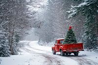 Midden in het winterse sprookjesbos, waar de sneeuw als een glinsterend tapijt ligt, rolt een knalrode pick-uptruck door het rustige landschap. Een feestelijk versierde kerstboom staat trots op de laadvloer en verspreidt hoop en vreugde. De zachte sneeuwvlokken die eromheen dansen creëren een magische sfeer die het hart verwarmt.