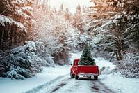 Een rode pick-up rijdt door een winterlandschap bedekt met een dik pak sneeuw. Een prachtige kerstboom staat trots op de laadvloer, klaar voor feestelijke kerstlekkernijen. Omringd door besneeuwde bomen straalt het tafereel een warme, nostalgische sfeer uit, alsof het uit een sprookjesboek komt.