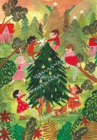 Een schattige illustratie om extra kerstsfeer in de kinderkamer te creëren. Een nordic dorp met veel kerstbomen, waar een kerstboom door kinderen uit de omliggende huizen wordt versierd. De honden helpen mee met de kerstlichtjes. Veel groen met rode en roze accenten, voor een klassieke kerst. Origineel acrylverf op papier.