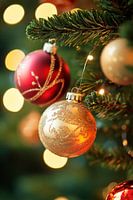 Glinsterende kerstballen in feestelijk rood en goud wiegen zachtjes aan de takken van een prachtige kerstboom, terwijl zachte lichtjes op de achtergrond een warm, uitnodigend licht uitstralen. Dit betoverende arrangement ademt de magische geur van Kerstmis en wekt onmiddellijk de verwachting van cadeautjes en gelukkige tijden met dierbaren.