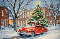 Een rode auto met een kerstboom trots op het dak glijdt zachtjes door een winters sprookjeslandschap. Dikke sneeuwvlokken dansen in de nachtelijke gloed en bedekken de straten met een glinsterende deken. De feestelijk versierde takken van de bomen omarmen de magie van Kerstmis, terwijl het warme licht uit de ramen van de huizen een gezellige sfeer verspreidt.