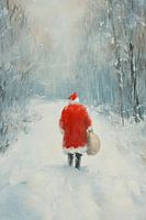 Een mysterieuze figuur in een felrode jas schrijdt door de winterse stilte en vormt een warm contrast met het glinsterende wit van de sneeuw. De zachte, glinsterende sneeuw omlijst het pad, terwijl de met sneeuw bedekte bomen het landschap veranderen in een betoverend sprookjeslandschap. Een aura van verwachting en ontdekking omringt deze eenzame wandelaar.
