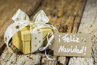 Kerstcadeau met tag spaanse tekst, Feliz Navidad betekent Vrolijk Kerstfeest, kerstkaart, kerstversiering, kerstdecoratie, wenskaart