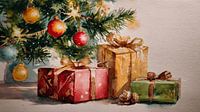 Deze sfeervolle aquarel toont prachtig ingepakte kerstcadeaus onder een feestelijk versierde kerstboom, met glinsterende ballen in warme tinten van rood, goud en blauw. De zachte penseelstreken en subtiele kleurverlopen geven het tafereel een nostalgische en handgemaakte charme. Elk geschenk is liefdevol verpakt met linten en strikken, wat het gevoel van verwachting en feestelijkheid versterkt. Een perfect kunstwerk voor wie houdt van traditionele kerstsymboliek met een ambachtelijke, warme uitstraling.