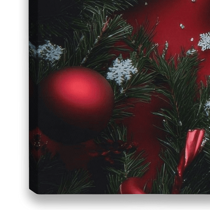 Een feestelijke aanblik vol verwachting: glanzende cadeautjes in glinsterend rood en goud, omringd door groene sparrentakken en fonkelende sneeuwvlokken. Dit levendige tafereel straalt kerstmagie en vreugde uit, perfect voor een woonkamer om de familie in een feestelijke stemming te brengen en de geest van de feestdagen in te ademen.