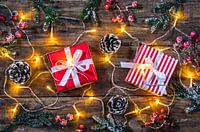 Koop de foto Kerstcompositie met geschenkdozen, dennentakken, dennenappels, rode bessen van Alex Winter op canvas, aluminium dibond, (ingelijste) fotoprint, behang en ArtFrame, op maat geprint in Fine-Art kwaliteit.