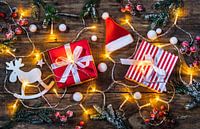 Koop de foto Kerstcompositie met geschenkdozen, kerstmuts, rendier en glimmend licht van Alex Winter als print op canvas, aluminium dibond, (ingelijste) fotoprint, behang en ArtFrame. Voor jou op maat geprint in Fine-Art kwaliteit.