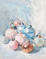 Kerstdecoratie | Glinsterende Feestdagen - Dit kerst schilderij toont een verzameling glinsterende en kleurrijke kerstballen in tinten van blauw en roze, kunstzinnig gerangschikt tegen een zacht, impressionistisch geschilderde achtergrond die de illusie van sneeuw oproept.
