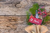 De plaats die van de het dinerlijst van Kerstmis met markering en Duitse tekst, Menue, betekent menu plaatsen