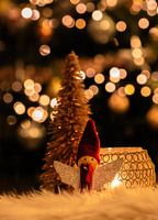 Portret van een rood Kerstelfje met zilveren vleugels dat bij een klein kerstboompje en een theelichtje staat op een witte schapenvacht. Op de wazige achtergrond zie je lichtjes van een kerstboom.