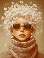 Te midden van een ijzige winterwereld verschijnt een figuur die lijkt te zijn voortgekomen uit de essentie van sneeuw en licht. Haar gezicht is zacht en porseleinachtig, met lippen die subtiel roze kleuren tegen de koude achtergrond. Haar ogen zijn verborgen achter stijlvolle zonnebrillen — alsof ze het schitterende licht van de winterzon of het hemelse schijnsel van de kerststerren moet temperen.