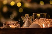 stilleven van een kersttafereel, met een glazen engeltje, kaarsjes erom heen en de bokeh lichtjes van de kerstboom op de achtergrond