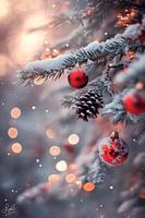 Glinsterende roodachtige kerstballen bengelen zachtjes aan besneeuwde sparrentakken, terwijl delicate lichtjes in de verte twinkelen. Dit winterse tafereel straalt gezelligheid en feestvreugde uit en is perfect voor in de woonkamer om een warme, uitnodigende sfeer te creëren tijdens de feestdagen.