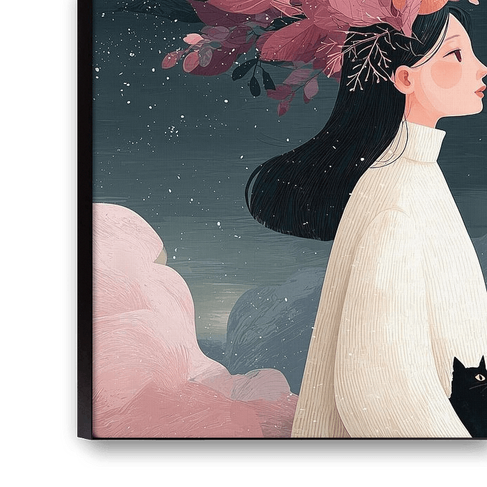 Een surrealistisch kunstwerk waarin winterse ornamenten en roze kerstballen als een dromerige gedachtenwolk samensmelten boven een vrouw in een witte coltrui. De zwarte kat als mystiek element en de sterrenhemel creëren een magische winterse sfeer, waarbij zachte rozetinten contrasteren met de donkere nachtelijke achtergrond.