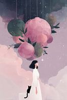 Een illustratie in zachte pasteltinten waar een vrouw in een witte jurk samen met een zwarte kat onder een verzameling zwevende bollen staat. De bollen zijn versierd met botanische elementen en hebben verschillende tinten roze en groen. De sterrenhemel en wolken creëren een mysterieuze, romantische sfeer die het geheel een…