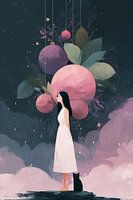 Een sfeervolle illustratie waarin een vrouw in een witte jurk staat te mijmeren onder gigantische roze kerstballen die als droomachtige planeten aan de nachthemel hangen. Een zwarte kat houdt haar gezelschap terwijl zachte sneeuwvlokken neerdwarrelen tegen een achtergrond van donkerblauw en roze tinten, omringd door delicate bladeren en…