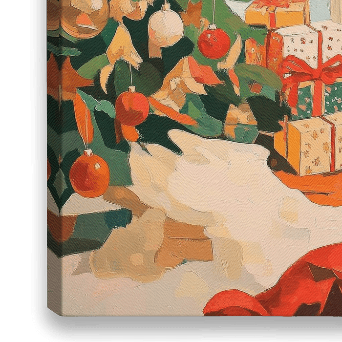 Een feestelijk versierde kerstboom gloeit in warme kleuren, terwijl fonkelende decoraties en cadeautjes een uitnodigende sfeer creëren. De knisperende open haard met zijn sfeervolle ambiance en de eerste sneeuw buiten zorgen voor pure gezelligheid. Perfect voor een woonkamer die uitnodigt om te blijven hangen en feest te vieren!