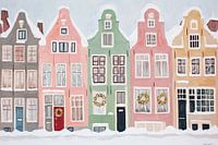 Kersthuizen - Dit stadsgezicht schilderij toont een rij kleurrijke, traditionele Nederlandse huizen bedekt met sneeuw, versierd met kerstkransen op de deuren, wat een vredig en feestelijk kersttafereel uitstraalt.