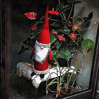 Een etalagefotokunstwerk. Kijkend in de etalage zien we een schattige kerstkabouter, verkleed als kerstman, zittend op een tafel met een wit kleed. Voor hem op de grond staan verschillende kamerplanten. Vlak achter hem op de tafel staat een anthuriumplant met het mooie rood van de bloemen en de felgroene bladeren die de kerstkabouter…