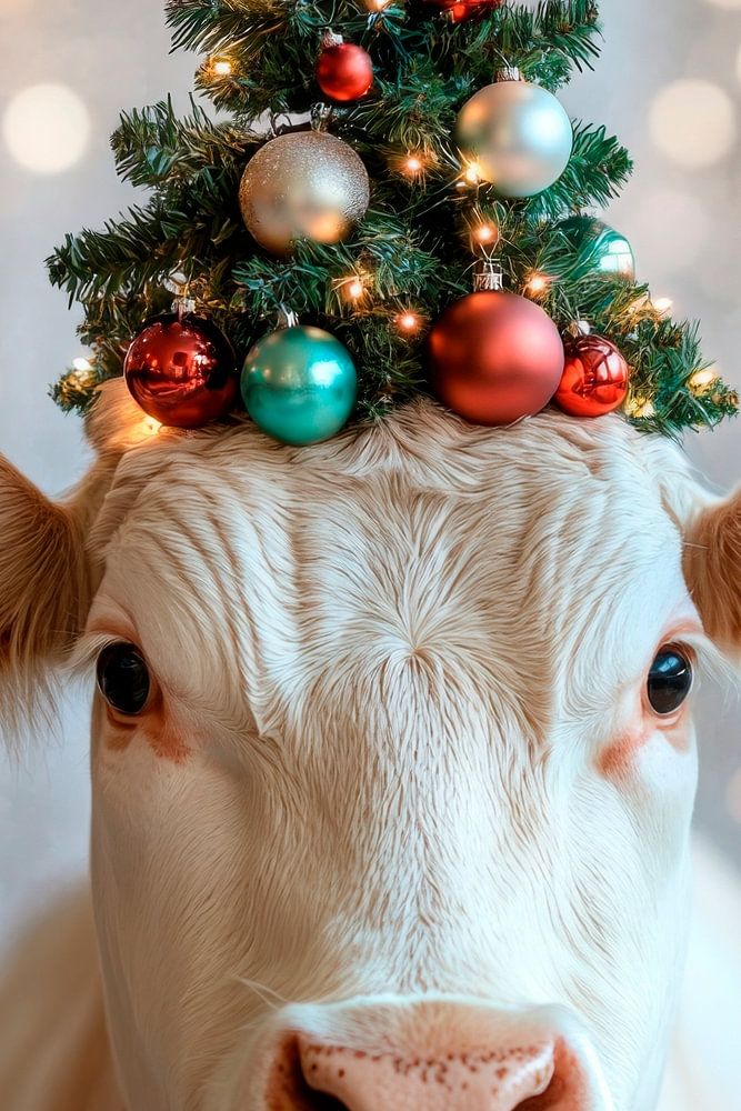 Een charmante koe met een feestelijk versierde kerstboom op haar hoofd schittert te midden van felle lichtjes. De mix van natuurlijke dierenliefde en feestelijke glamour voegt een humoristisch tintje toe aan elke kamer. Dit unieke kunstwerk zou het perfecte middelpunt zijn in de woonkamer, ideaal voor vrolijke gesprekken en een gezellige sfeer.