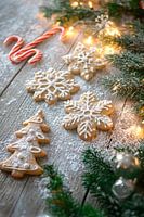 Een feestelijke geur van vers gebakken peperkoek vult de kamer, terwijl glinsterend glazuur de winterkoekjes in sneeuwvlok- en boomvorm laat glanzen. Omringd door zacht gloeiende lichtjes en een vleugje sparrengroen ontvouwt zich hier een winterwonderland dat gezelligheid en feestelijke verwachting belooft.