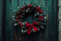 Een feestelijke krans van dennenappels en felrode bessen symboliseert de magie van het kerstseizoen. De delicate strik in een dieprode kleur voegt een vleugje elegantie toe. Dit decoratieve accent brengt warmte en vreugde en is perfect voor de voordeur om gasten met een warm welkom te begroeten.