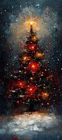 Kerstlicht | Fonkelende Kerstboom Sfeer - Dit Kerstmis schilderij toont een rijkelijk verlichte Kerstboom met heldere rode ornamenten en een schitterende ster bovenaan, geaccentueerd door energieke, kleurrijke spatten en een sfeervolle, donkere achtergrond.
