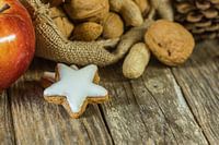 Koop de foto Kerstmaaltijd op tafel, noten, appel en stervormig koekje van Alex Winter op canvas, aluminium dibond, (ingelijste) fotoprint, behang en ArtFrame, op maat geprint in Fine-Art kwaliteit.