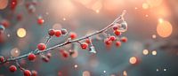 Delicate rode bessen fonkelen in het zachte licht, terwijl zachte waterdruppels de schatten van de natuur benadrukken. De harmonieuze combinatie van warme kleuren en magisch licht geeft de kamer een uitnodigende uitstraling. Perfect voor de woonkamer om een vleugje elegantie en rust op te roepen.