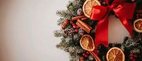 Een vleugje feestelijkheid streelt deze betoverende kerstkransharmonie, die verrukt met zijn helderrode kleur en geurige kaneelstokjes. Gedroogde sinaasappelschijfjes en delicate bessen maken het arrangement compleet en stralen een gezellige, huiselijke sfeer uit. Deze krans is perfect voor de keuken of woonkamer en creëert een uitnodigende sfeer die de magie van de feestdagen in huis brengt.