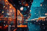 Een winters sprookje ontvouwt zich terwijl zachte sneeuwvlokken door de lucht dansen en feestelijke lichtjes de achtergrond verlichten. De warme gloed van de ramen nodigt uit tot dromen en creëert een gezellige sfeer. Perfect voor in de woonkamer om de gezellige sfeer van het koude seizoen op te roepen.