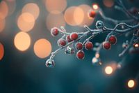 Een delicate tak, versierd met felrode bessen en glinsterende rijp, glinstert zachtjes op de achtergrond van gouden lichtjes. Deze harmonieuze compositie straalt een magische wintersfeer uit die perfect past in een woonkamer en uitnodigt om een feestelijke sfeer te creëren. Ideaal voor momenten waarop gezelligheid en warmte centraal staan.