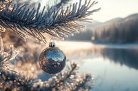 Een glinsterende kerstbal hangt aan een ijzige tak, omringd door een betoverend winterlandschap en weerspiegelend water. De koele kleurtinten en het magische spel van licht en schaduw creëren een rustige, feestelijke sfeer. Perfect voor in de woonkamer om een gezellige sfeer te creëren tijdens de kerstperiode.