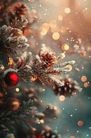 Met glinsterende lichtjes, zachte sneeuwvlokken en de zachte gloed van rode kerstballen straalt deze foto feestelijke warmte uit. De besneeuwde takken en dennenappels voegen een rustiek tintje toe. Perfect voor in de woonkamer, het brengt een vleugje gezelligheid en kerstmagie in elke kamer en laat harten sneller kloppen.
