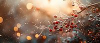 Delicate, gloeiende rode bessen glinsteren in het winterse licht terwijl zachte sneeuwvlokjes eromheen dansen. Het harmonieuze kleurenpalet van warme bruintinten en sprankelend goud straalt gezelligheid uit. Dit kunstwerk is ideaal voor de woonkamer, creëert een uitnodigende sfeer en doet harten denken aan winterse gezelligheid.