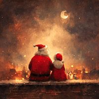 Deze ontroerende illustratie toont de Kerstman en een kind, zittend zij aan zij op een besneeuwd dak, kijkend naar een fonkelende hemel met een halve maan. Hun rode pakken lichten zacht op in het warme gloedlicht van de stad onder hen. De penseelachtige stijl en sfeervolle verlichting geven het beeld een dromerige, bijna magische kwaliteit. Het straalt een gevoel uit van verbondenheid, rust en de stille magie van Kerstnacht.