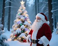 Achter hem strekken de elegant versierde kerstbomen zich uit in hun pracht, met gloeiende kerstballen en twinkelende lichtjes die elke boom prachtig laten schitteren. De stilte van het bos wordt alleen verbroken door af en toe het geluid van de wind, wat een vredige sfeer creëert. Op dit moment, omringd door de onmiskenbare magie van Kerstmis, belichaamt de Kerstman de vreugde en magie van het seizoen en nodigt hij iedereen uit om te delen in deze feestelijke rust.