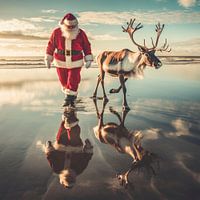Een vrolijke kerstman wandelt ontspannen langs de kust, vergezeld door zijn majestueuze rendieren, terwijl de zachte golven het licht weerkaatsen. Dit harmonieuze tafereel geeft elke kamer een feestelijk tintje en is perfect voor in de woonkamer om een magische kerstsfeer te creëren.
