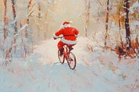 Te midden van een besneeuwd winterlandschap trapt een vrolijke figuur in felrood alsof hij de stille tonen van de natuur vermengt. De zachte lichtstralen breken door de boomtoppen en geven het tafereel een magische gloed, terwijl de verse sneeuw zachtjes knispert onder het stuur. Een onvergetelijk beeld van vreugde en feestelijkheid.
