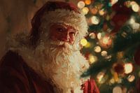 Deze sfeervolle kunstafbeelding toont de Kerstman in een intiem moment vol warmte en nostalgie. Zijn vriendelijke gezicht, omlijst door een volle witte baard en klassieke rode mantel, wordt zacht verlicht door de twinkelende lichtjes van een rijkversierde kerstboom op de achtergrond. De penseelstreken geven het beeld een schilderachtig karakter dat doet denken aan traditionele kerstillustraties. De combinatie van warme kleuren en zachte lichtreflecties roept een gevoel op van geborgenheid en feestelijkheid – een perfecte keuze voor wie de magie van Kerstmis wil vangen in zijn interieur.