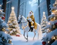 De Kerstman staat majestueus in het hart van een pittoresk, besneeuwd bos, omringd door de hoogste kerstbomen, hun groene takken zwaar met glinsterende sneeuw. Zijn felrode vacht steekt fel af tegen de glanzend witte achtergrond, terwijl de witte bontrand op zijn tent en hoed op verse sneeuw lijkt. Zijn vrolijke, sprankelende ogen…