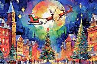 Digitaal impressionistisch schilderij van een kerstman welke met zijn slee, voortgetrokken door rendieren, boven een feestelijk verlicht plein vliegt. Het plein in dit kerstdorp is versiert met kerstbomen en lichtjes. In de tussentijd lopen er mensen langs de kerstkraampjes. Kortom, het is volop genieten van de kerstdagen en dát was mijn inspiratie voor het maken van dit kunstwerk.