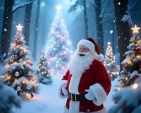 De Kerstman staat majestueus in het hart van een pittoresk, besneeuwd bos, omringd door de hoogste kerstbomen, hun groene takken zwaar met glinsterende sneeuw. Zijn felrode vacht steekt fel af tegen de glanzend witte achtergrond, terwijl de witte bontrand op zijn tent en hoed op verse sneeuw lijkt. Zijn vrolijke, sprankelende ogen…