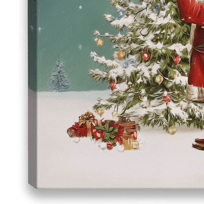 Kerstsfeer; de kerstman versiert de kerstboom met kerstballen lichtjes en cadeautjes.